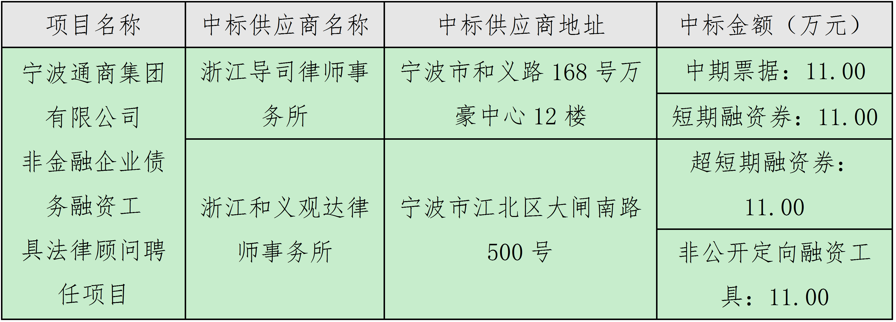 寧波市國際招標有限公司就寧波通商集團有限公司非金融企業債務融資工具法律顧問聘任項目進行國內邀請招標,經過評標委員會評審,現將采購結果公告如下: