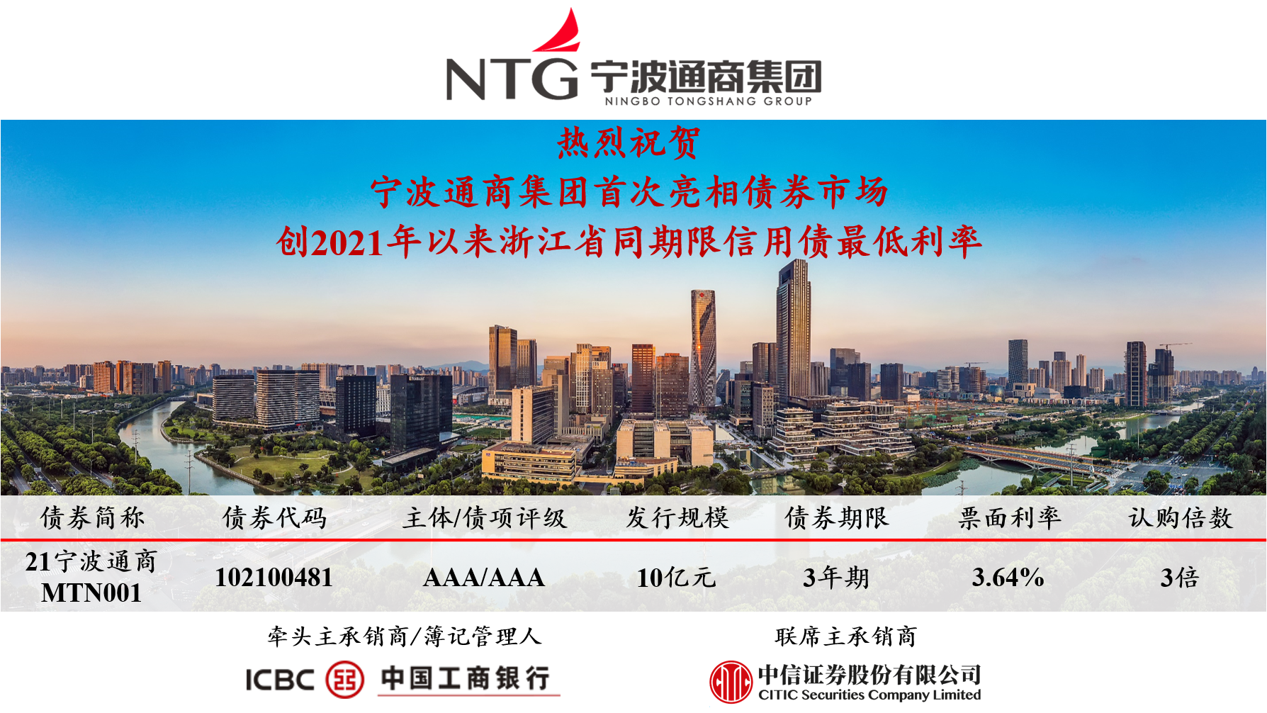 3月22日,寧波通商集團有限公司(以下簡稱“通商集團”)以3.64%的票面利率,成功發行了首單規模10億元期限為3年的中期票據,創2021年以來浙江省同期限信用債最低利率。