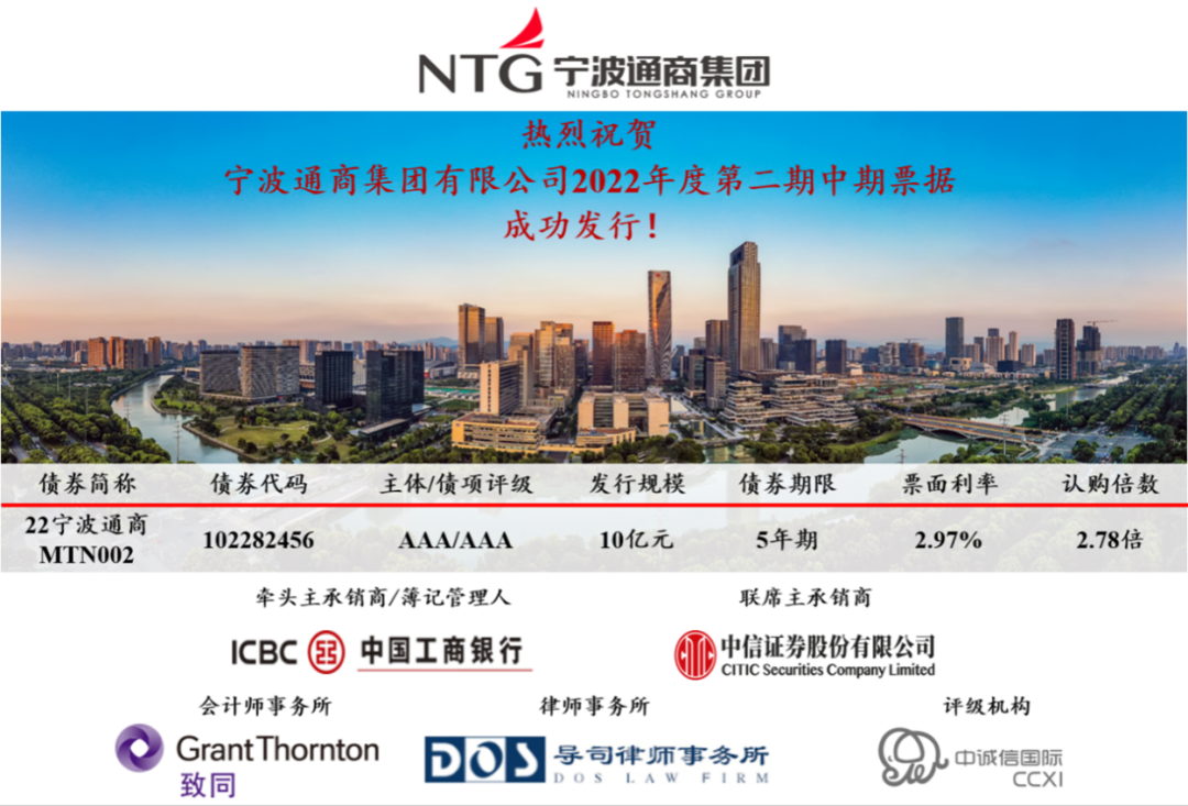 近日,寧波通商集團有限公司(以下簡稱“集團”)2022年第二期中期票據(jù)成功發(fā)行,發(fā)行金額10億元,期限5年,票面利率2.97%,全場認購倍數(shù)達2.78倍。