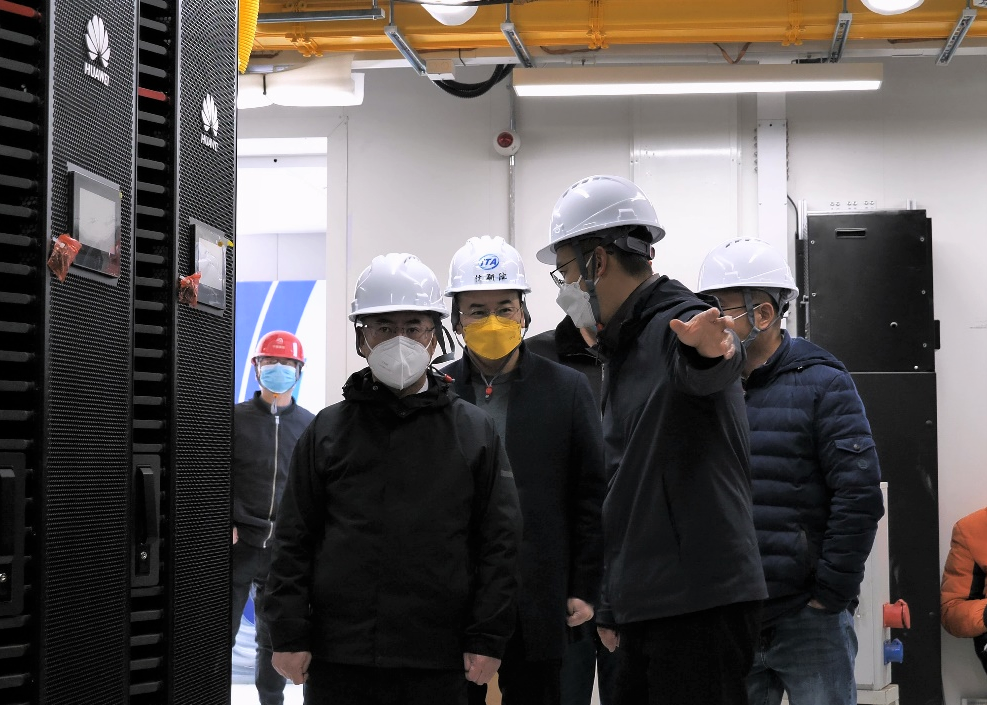 在超算中心施工現(xiàn)場,宋達軍聽取項目建設進度匯報,并詳細調(diào)研智算集群機房、超算集群機房和超算展廳等重點區(qū)域的推進情況,詢問目前設備到貨和施工進度存在的困難。